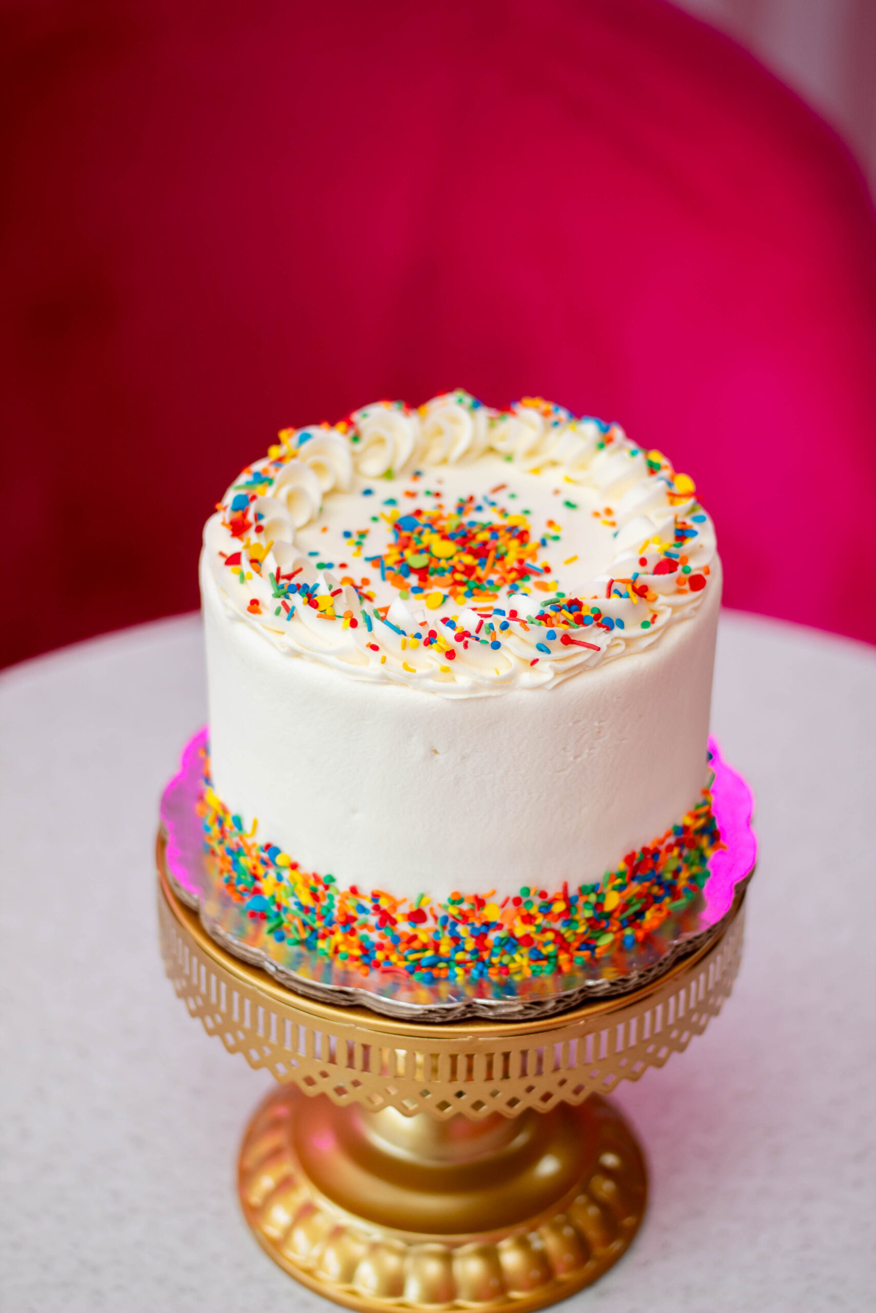 Pan de vainilla relleno de fresa, decorado con betún de mantequilla y sprinkles de colores.