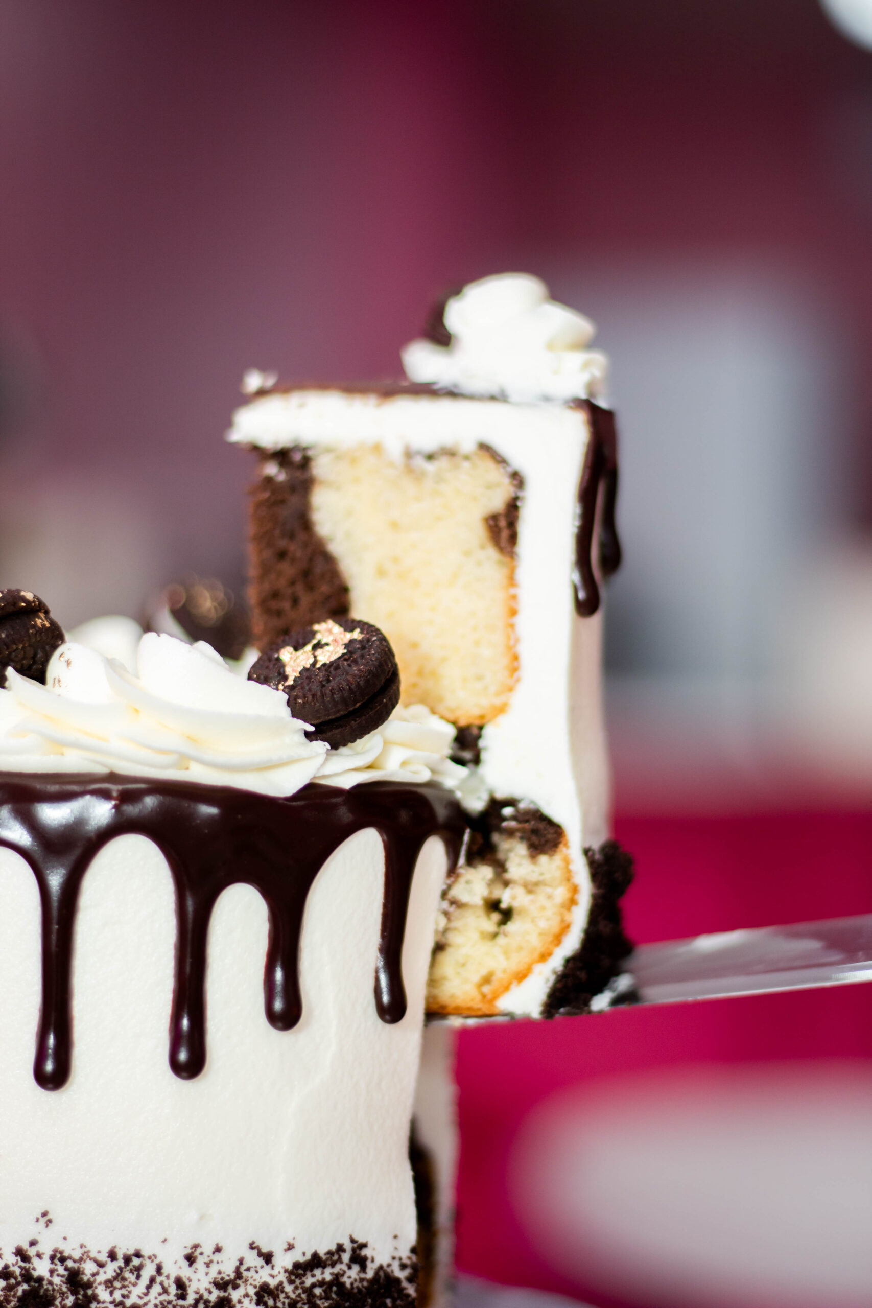 Pan marmoleado relleno de oreo, decorado con betún de oreo-mantequilla, ganache de chocolate y Oreo.