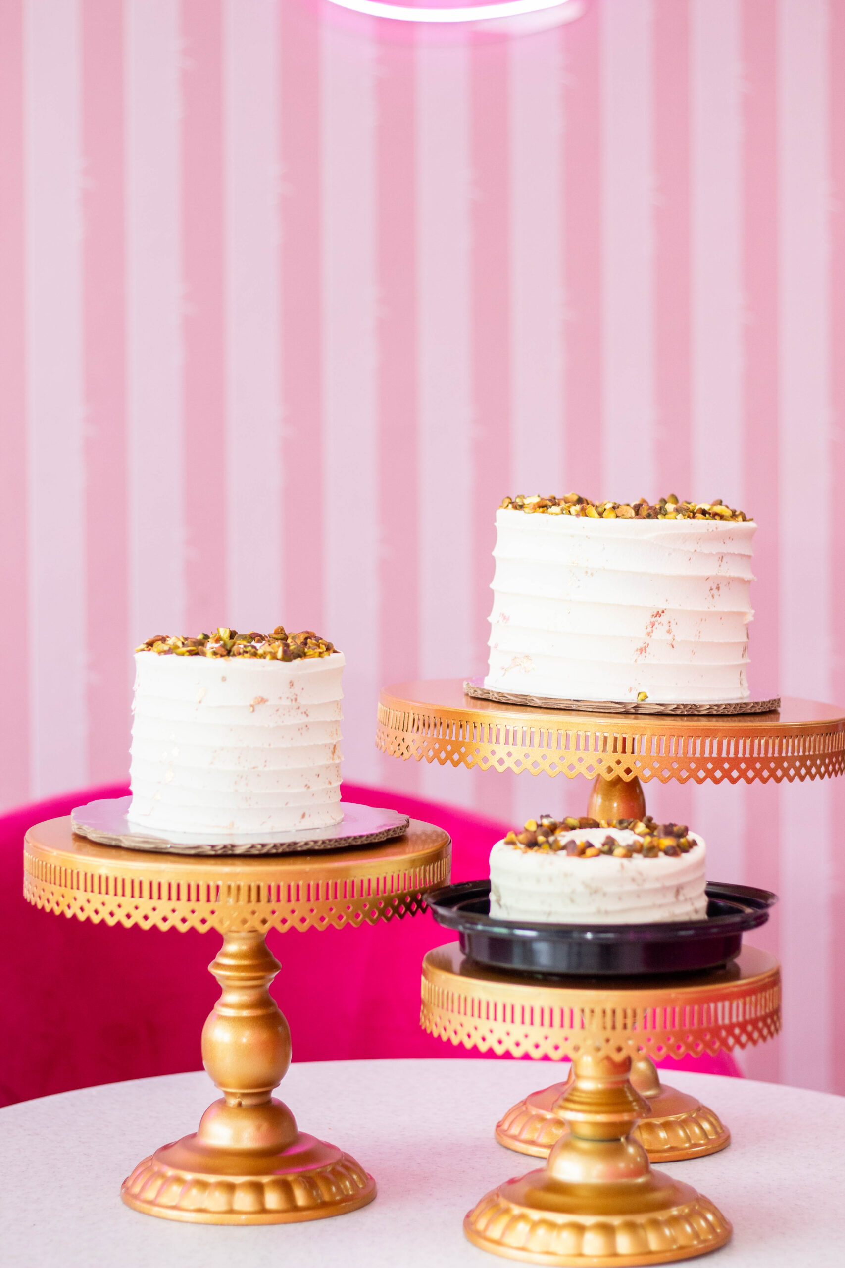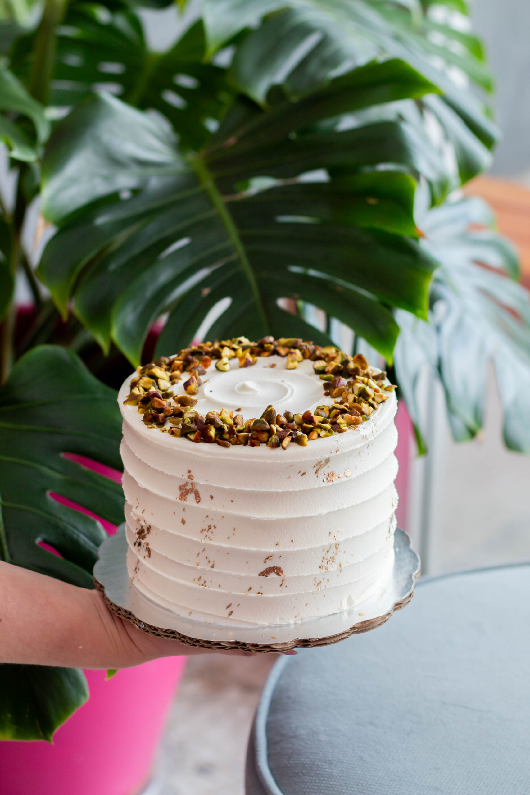Pan de vainilla relleno de dulce de leche con pistache, decorado con betún de mantequilla, detalles de dorado y pistache.