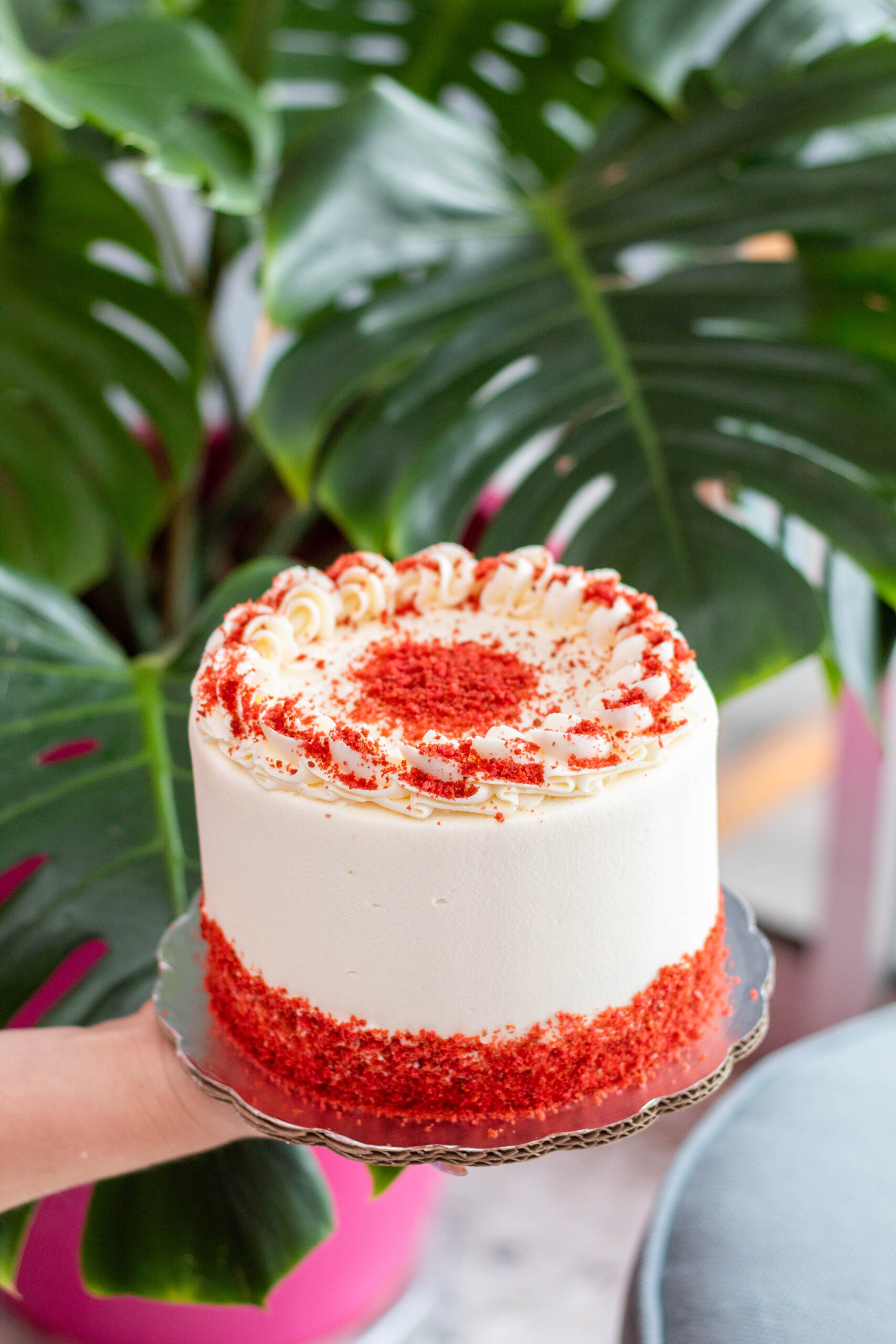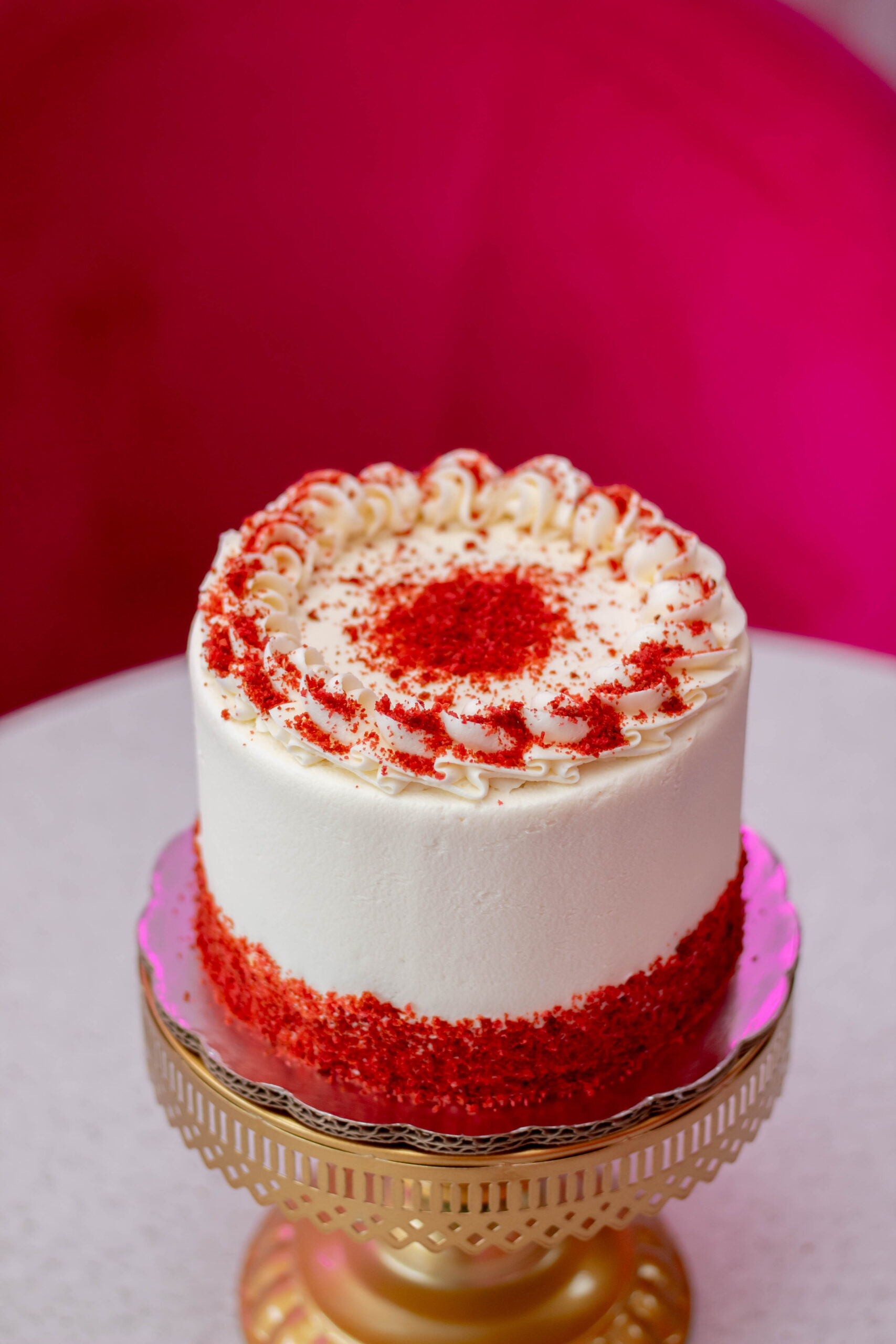 Pan de red velvet relleno de crema de chocoavellana, decorado con betún de mantequilla.